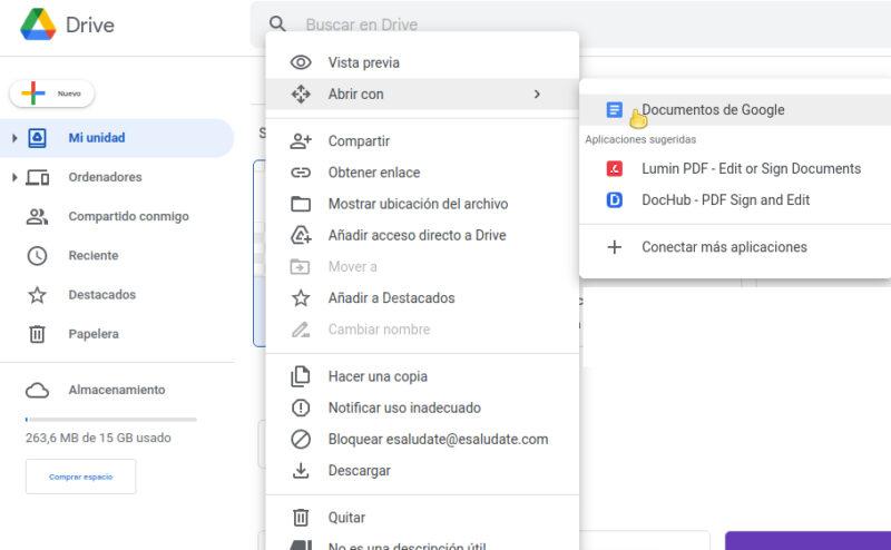 - Pulsa en Abrir con > Documentos de Google