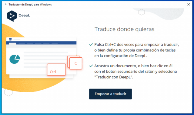 La ventaja de la versión de escritorio es que nos permite utilizar el traductor sin tener que acceder a la Web de DeepL, al tener la aplicación instalada y seleccionando un texto de cualquier aplicación de nuestro Windows al pulsar dos veces Ctrl+C se traducirá. Y si es Mac pulsando dos veces Command+C.