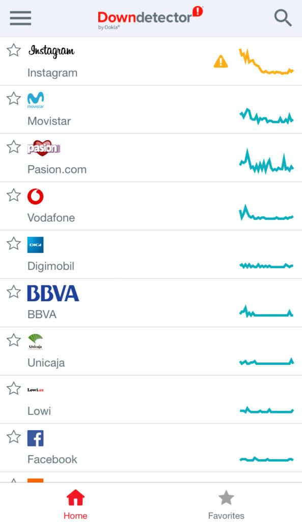 Downdetector te muestra por orden de más a menos incidentes de conectividad los servicios y puedes añadir los que te interese a tus favoritos. Incluye un buscador y si pulsas en el servicios que buscas te dará el reporte de las últimas 24 horas, con un mapa de puntos calientes y comentarios de otros usuarios sobre el estado de la incidencia.